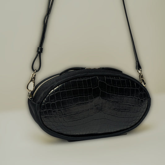 CROCODILE LEATHER MATTE BLACK OVAL SHOULDER BAG