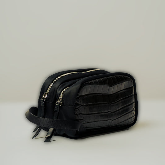 CROCODILE LEATHER MATTE BLACK DOUBLE ZIPPER POUCH