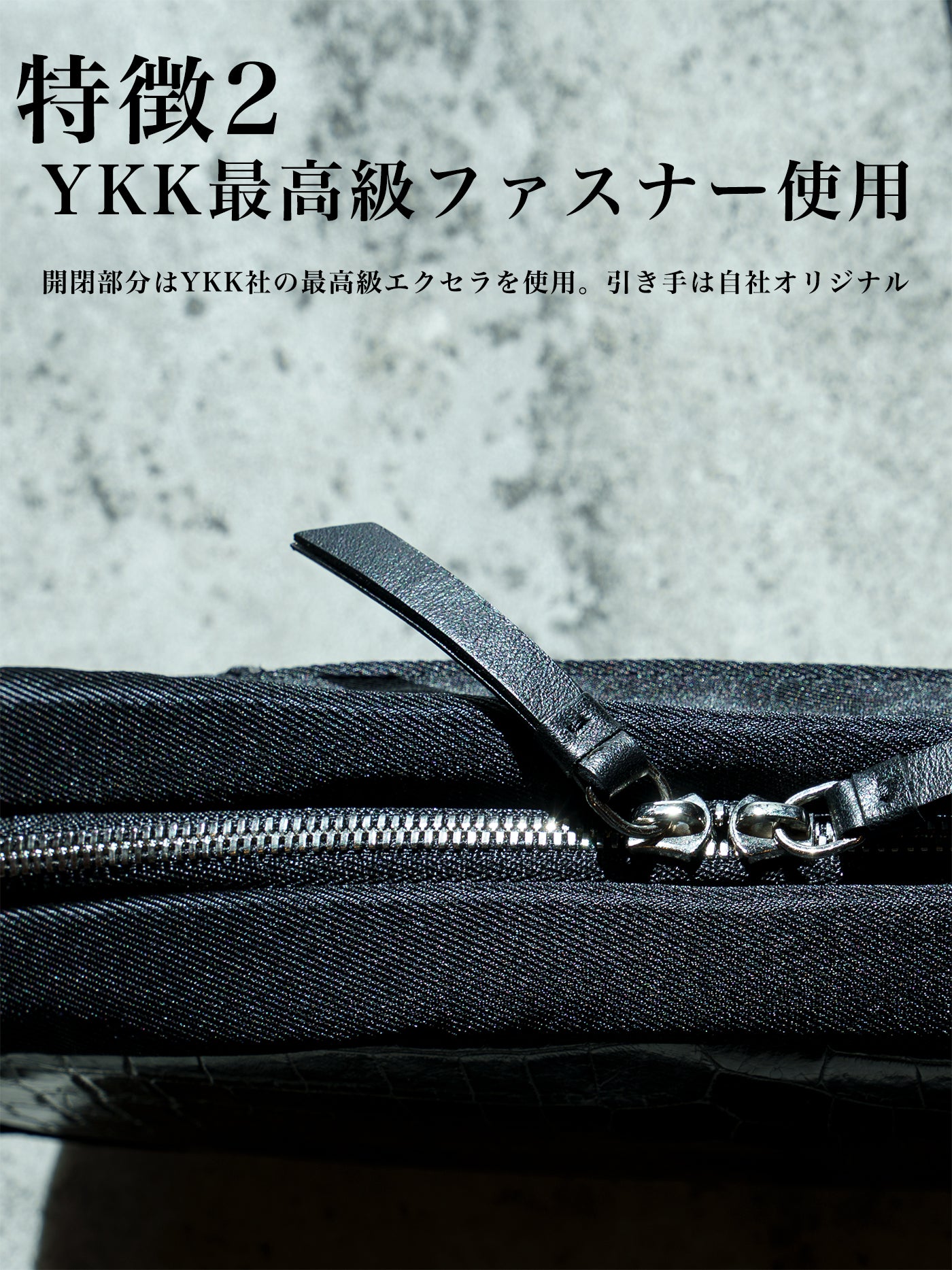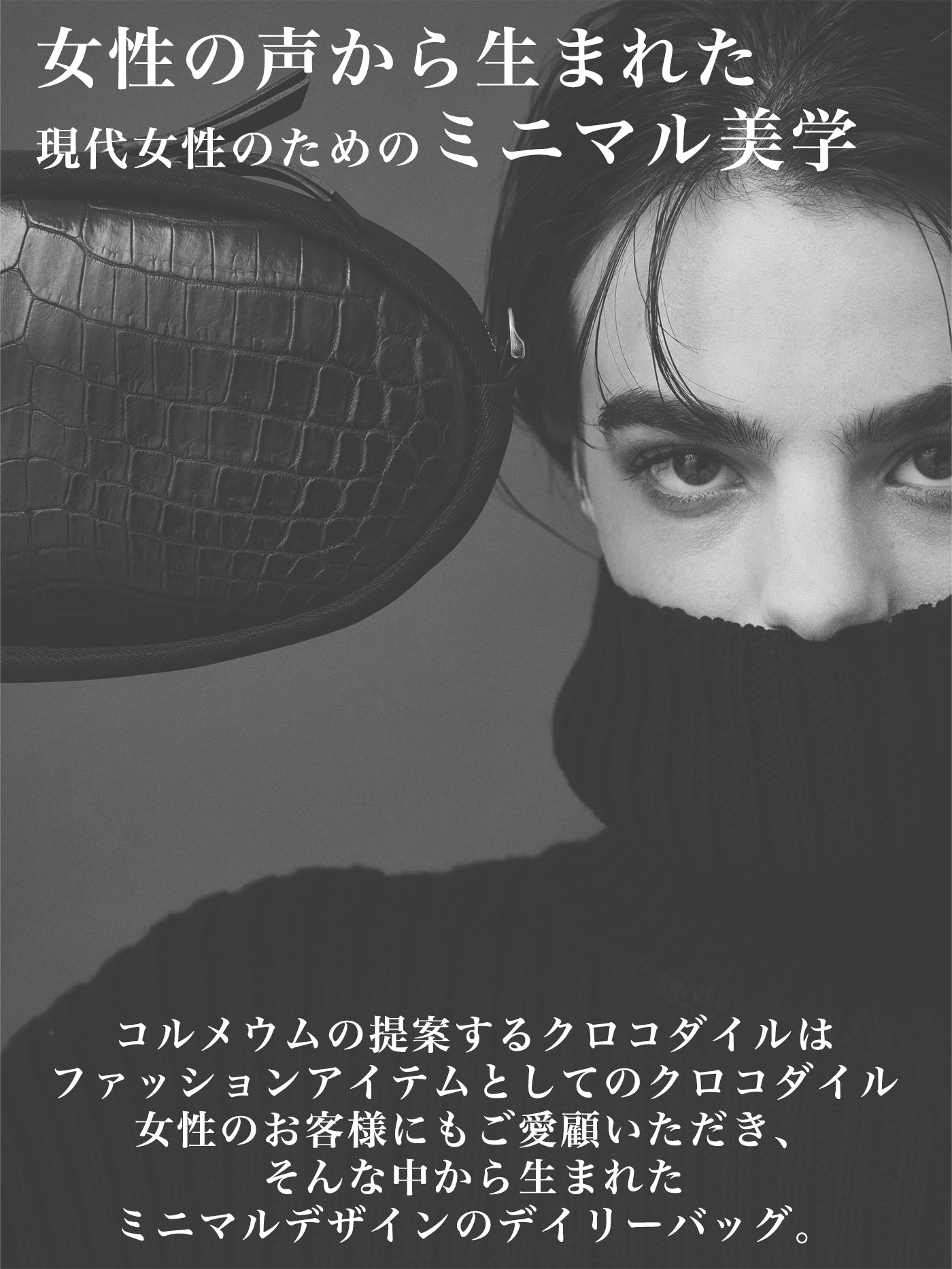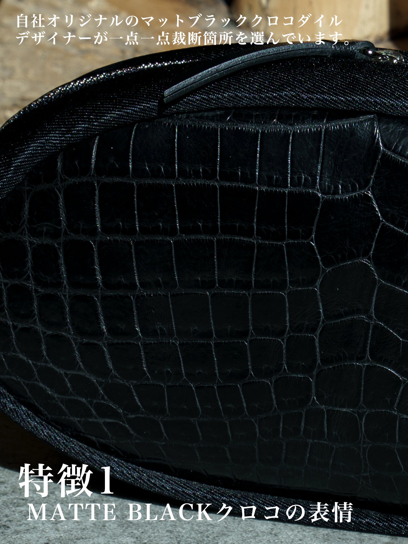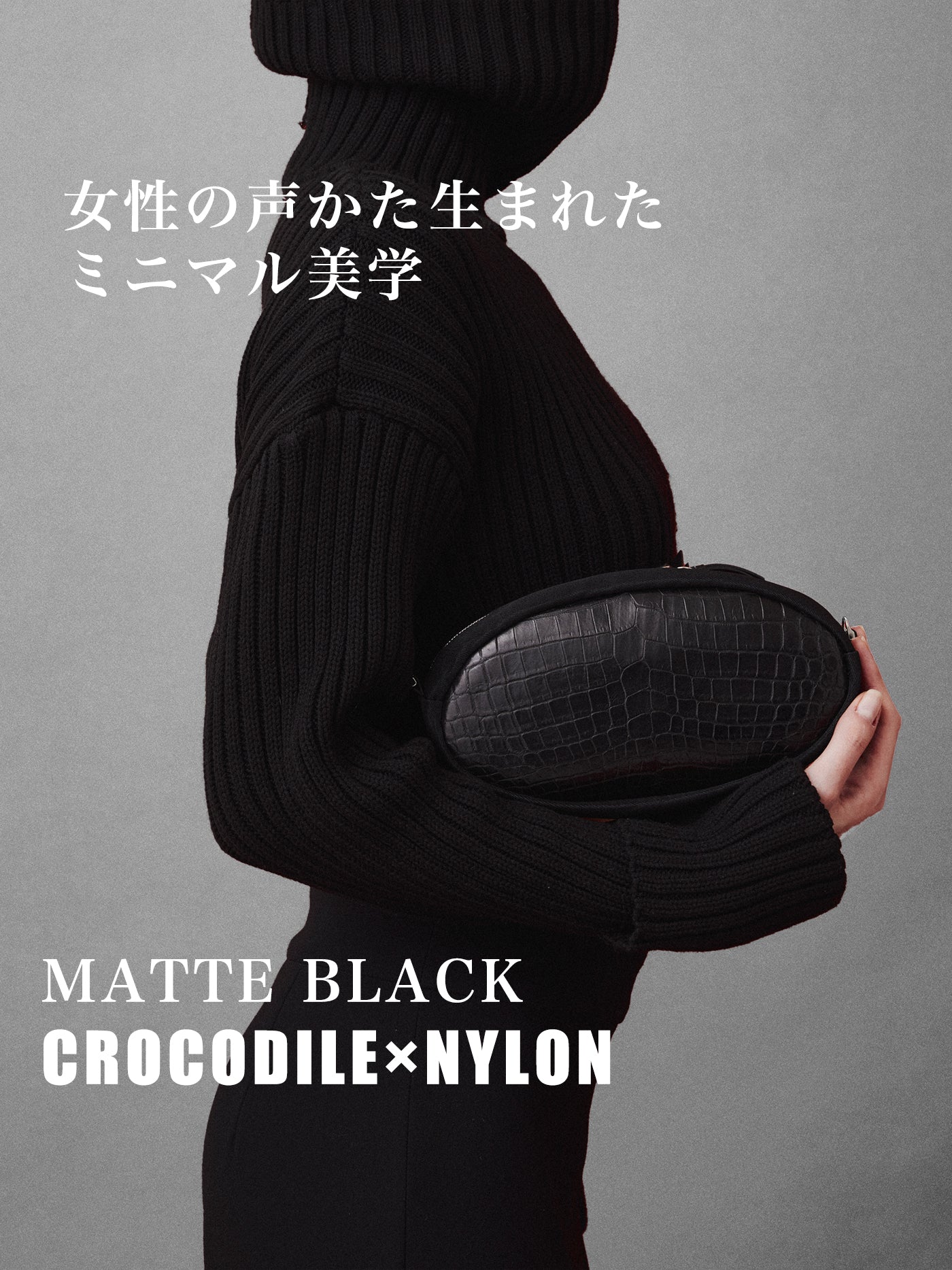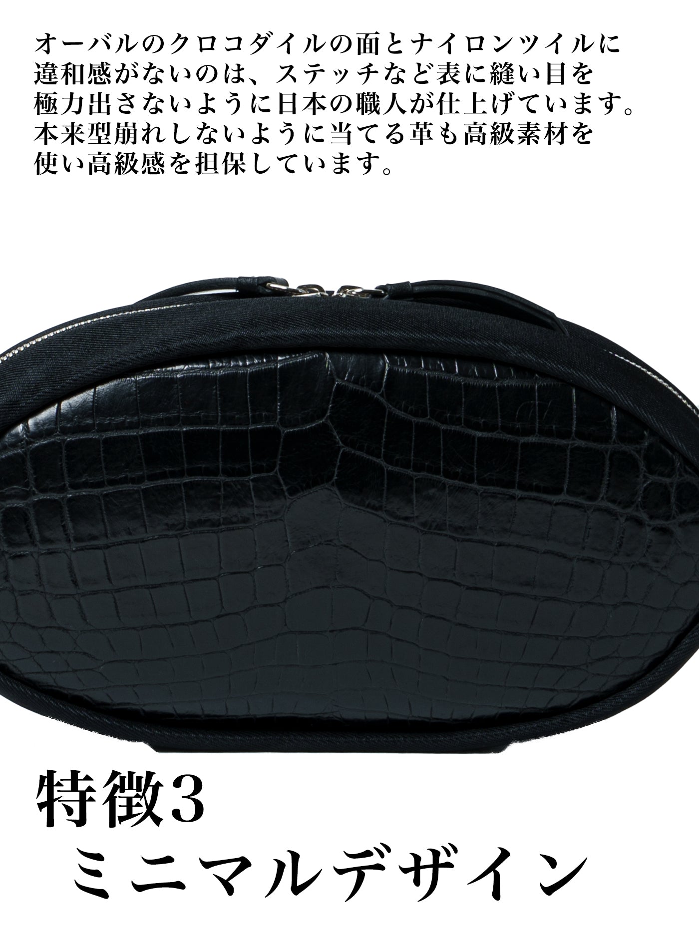 細やかな班柄(パターン)が美しい、おどろくほど軽くスリムなショルダーバッグ。オーバル型のシルエットがシンプルでシック。デザイン性だけでなく、開口部を広くすることで使いやすさも考え抜かれています。上質なクロコダイルに特殊な製法で織りあげたナイロン素材を合わせているため、カジュアルになりすぎず上品な光沢を放ちます。